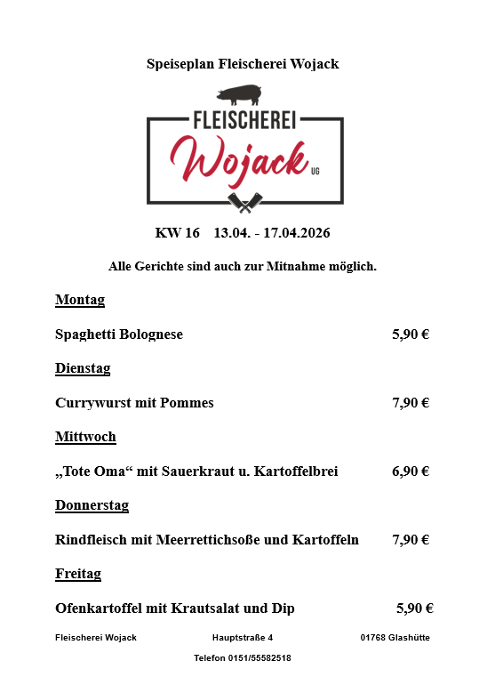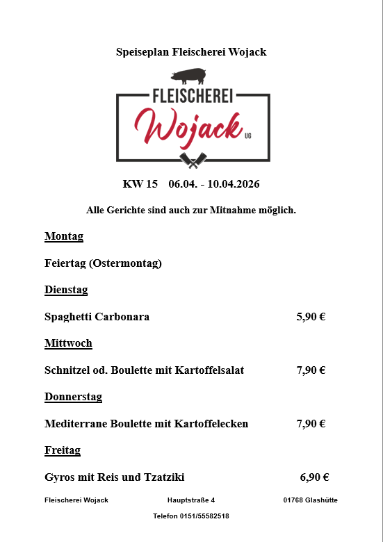 Die Fleischerei Wojack UG in Glashütte wurde im Juni 2024 gegründet. Unser Konzept ist den Weg zwischen den ,,alten“ Vorzügen des traditionellen Handwerks und modernen Produkten, Dienstleistungen und Ideen zu finden.