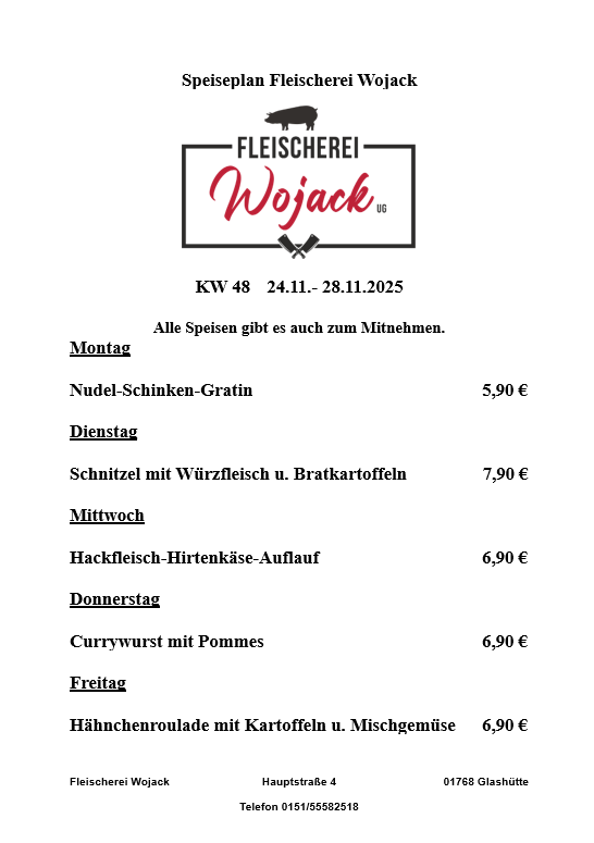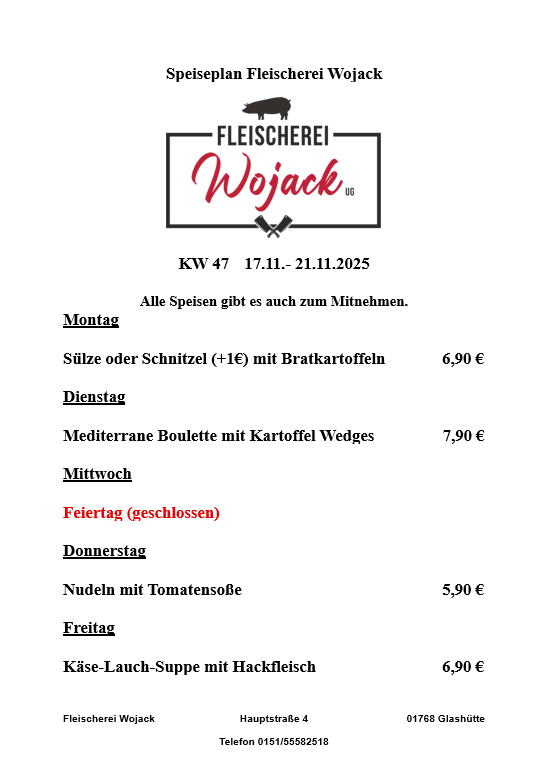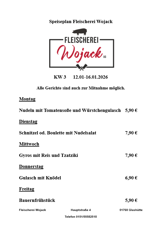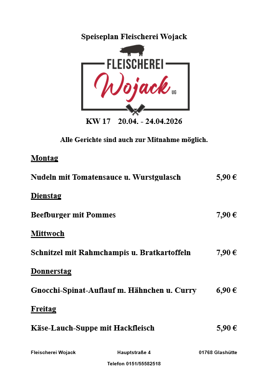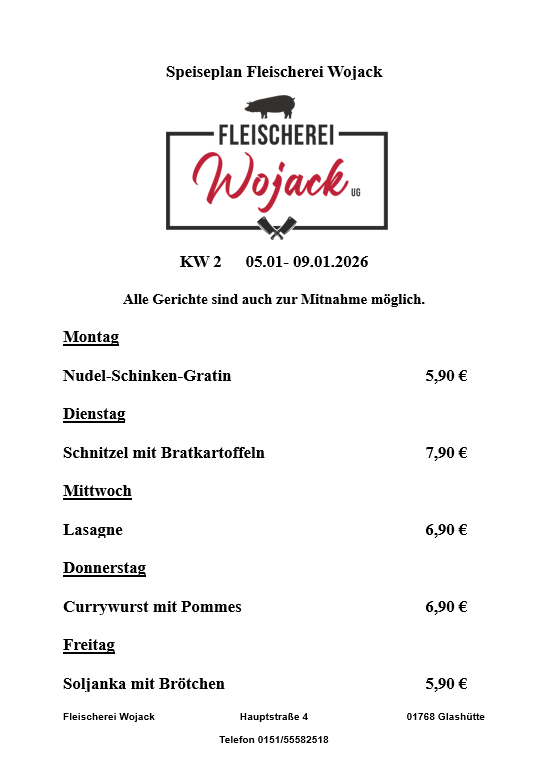 Die Fleischerei Wojack UG in Glashütte wurde im Juni 2024 gegründet. Unser Konzept ist den Weg zwischen den ,,alten“ Vorzügen des traditionellen Handwerks und modernen Produkten, Dienstleistungen und Ideen zu finden.